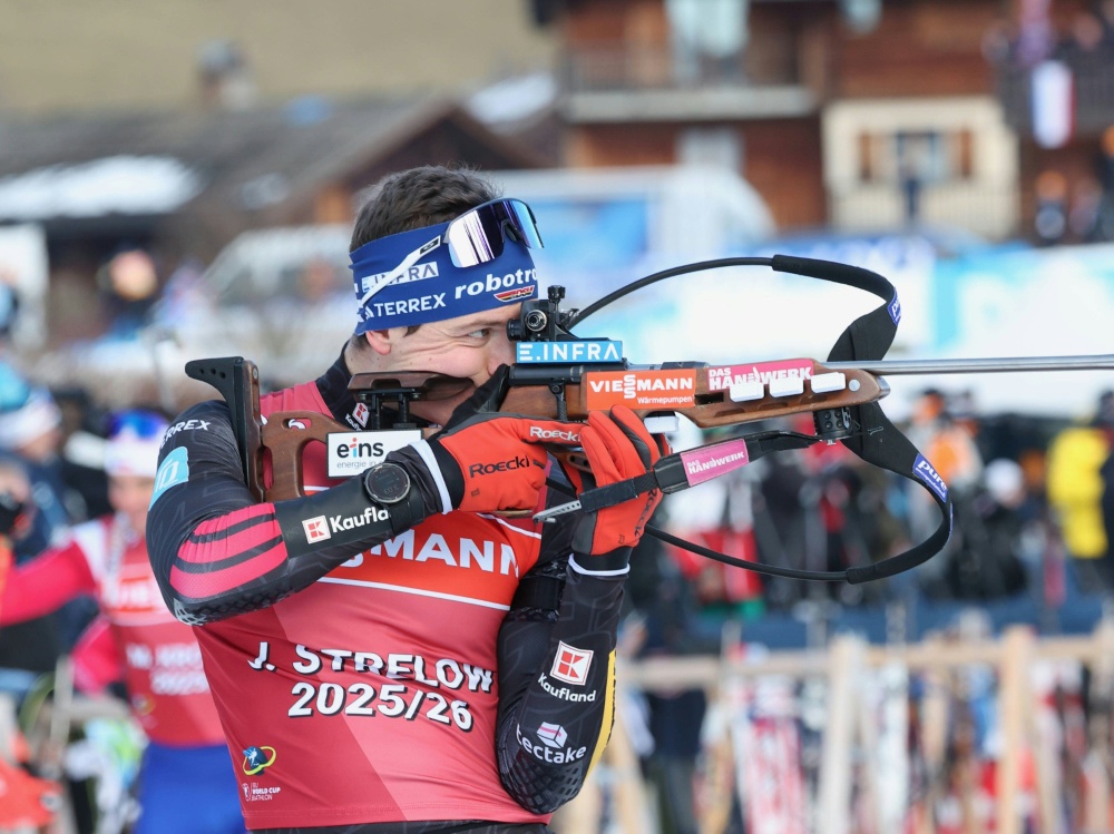 Der deutsche Biathlet Justus Strelow hat im Massenstart von Le Grand Bornand nur knapp das zweite deutsche Einzelpodest des Winters verpasst. Einen Tag nach dem Schießdebakel des DSV-Teams in der Verfolgung belegte der 28-Jährige ohne Strafrunde den vierten Platz (21,8 Sekunden), zu Vetle Sjaastad Christiansen aus Norwegen (2/+21,3) auf Rang drei fehlte nur eine halbe Sekunde. Den Sieg sicherte sich der Italiener Tommaso Giacomel (1 Strafrunde) vor Lokalmatador Éric Perrot (0/+18,1).