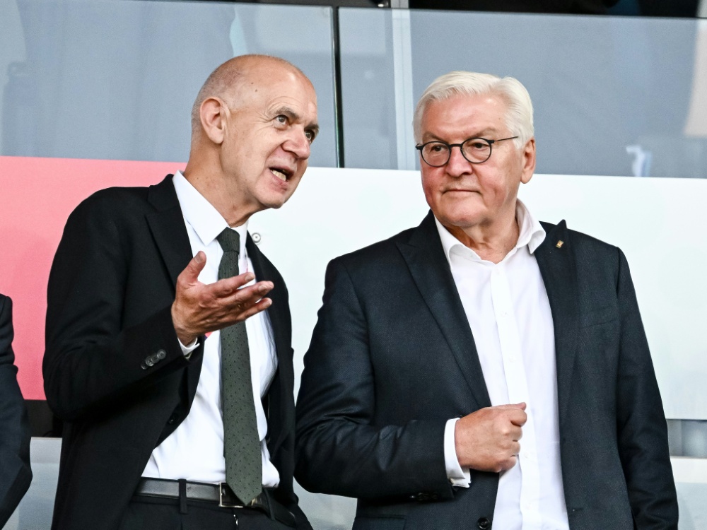 Neuendorf (l.) und Bundespräsident Steinmeier ((picture alliance/Harry Langer/DeFodi Images) - Harry Langer - (picture alliance/Harry Langer/DeFodi Images)/SID)